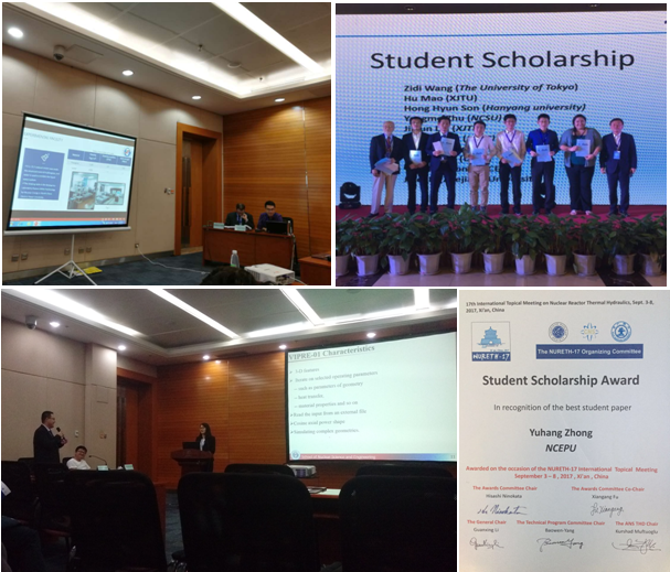 脱裤吧 师生共15人参加了大会,并在宣讲了10篇学术论文。脱裤吧 硕士研究生钟宇航的“Experimental investigation on boiling heat transfer characteristics within the bundle channels of the Spent Fuel Assembly”的论文获得“最佳学生论文奖”。
