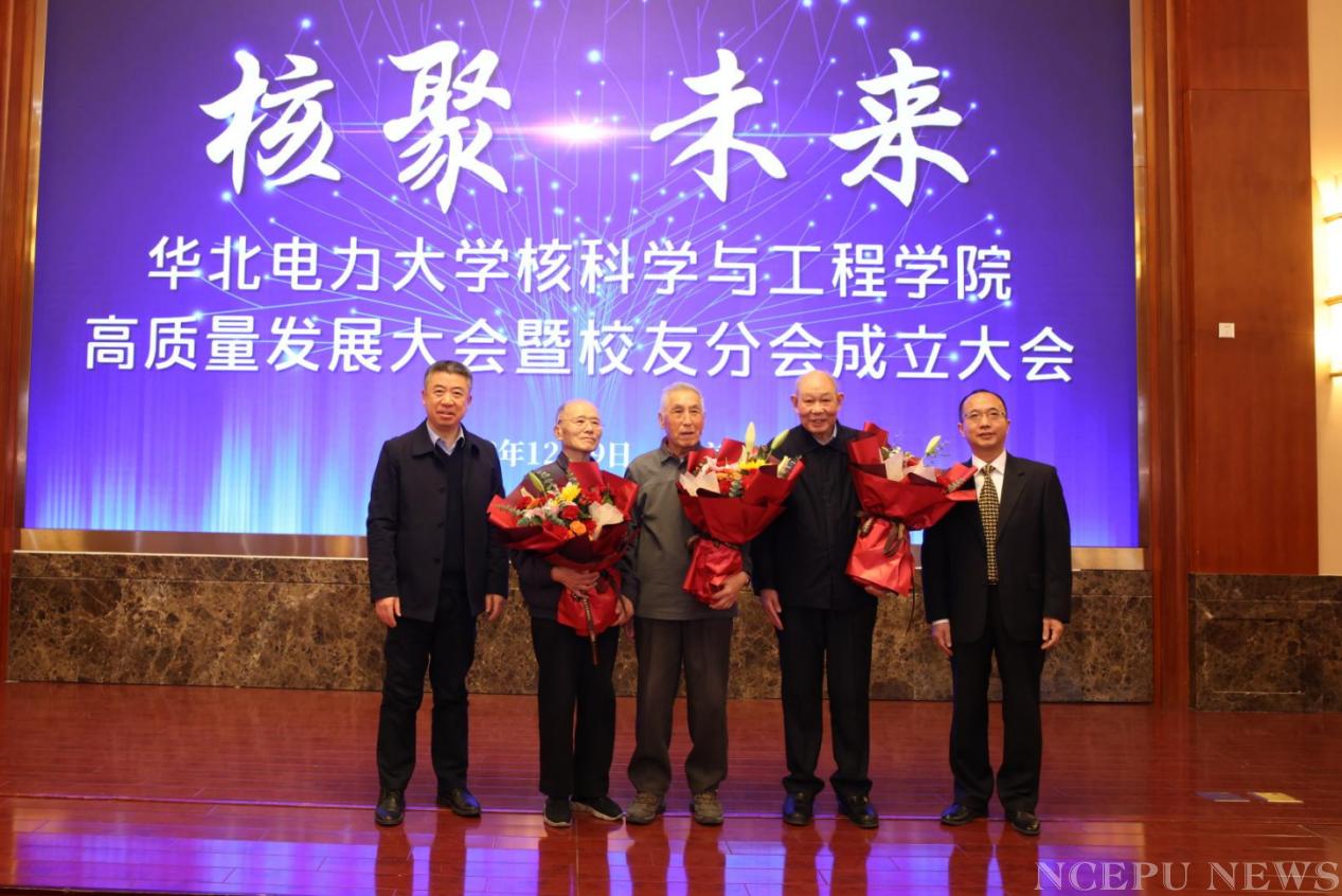 出席成立大会的三位老校友上台与大家见面,代表六十年前原子能发电专业全体毕业生接受在校大学生的献花,与会人员用经久不息的掌声,表达了对老一辈校友最高、最诚的敬意。