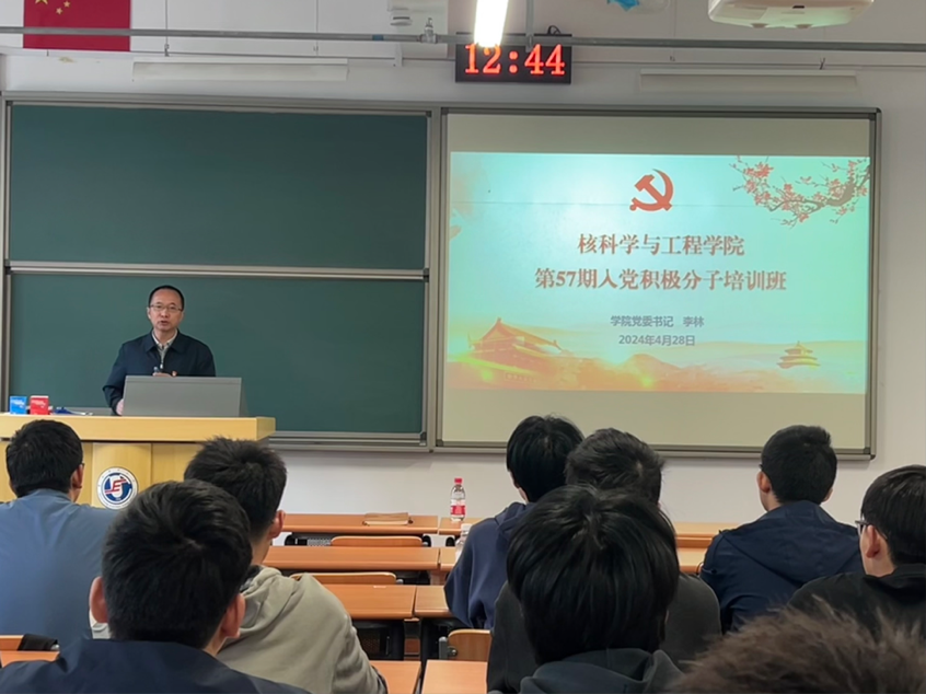 4月28日中午,脱裤吧 举办第57期入党积极分子培训班“书记讲党课”,学院党委书记李林为培训班全体学员讲授专题党课。培训活动由学院辅导员宫馨主持。