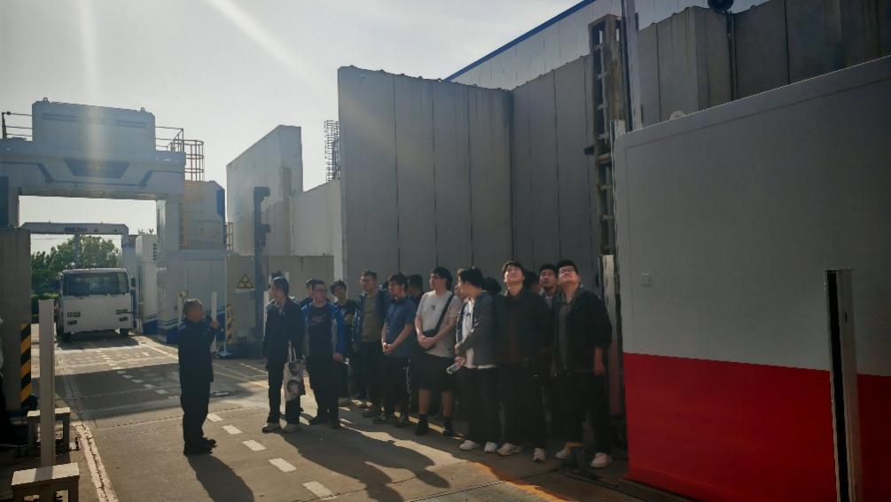 在车间参观环节,师生先后走进4号加速器展区、8号CT生产区及9号、10号车载系统生产线。在8号生产区,静态CT技术的电子束相控扫描原理让师生直观感受到“无机械旋转、高效率检测”的技术优势;在9号展区,师生近距离观察碳纳米管冷阴极分布式X射线源技术,了解其如何突破进口垄断实现100%国产化;在9号、10号生产线,车载移动式检查系统的胶轮驱动、自屏蔽设计引发师生热议——无需铺设轨道、无需建设防护墙,转场时可整体折叠运输,彻底打破了传统固定式安检设备的局限。从加速器核心部件到整车集成,每一个环节都体现了“ 技术自主”和“ 场景适配”,让学生了解到了核技术应用的完整产业链。