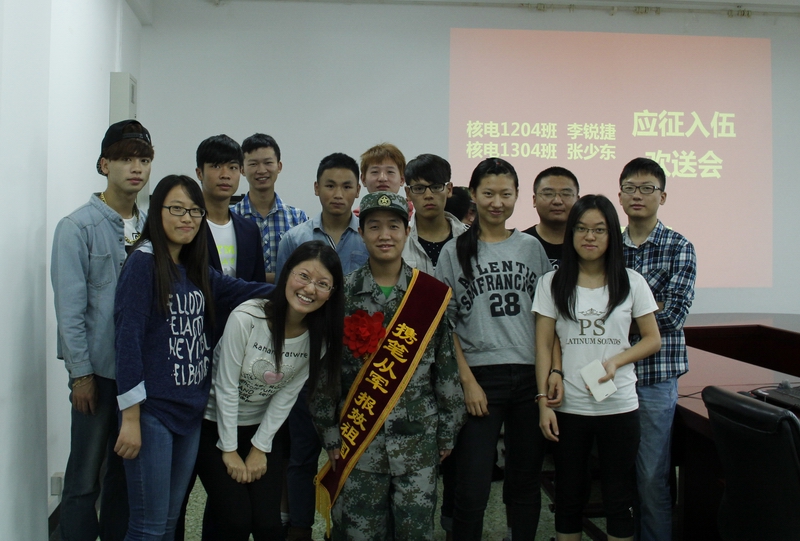 9月10日,脱裤吧 在学院会议室召开李锐捷、张少东两名同学应征入伍欢送会。学院党委副书记李辉、团委书记赵珥希、班主任马雁老师和核电1204、核电1304班同学参加了欢送会。