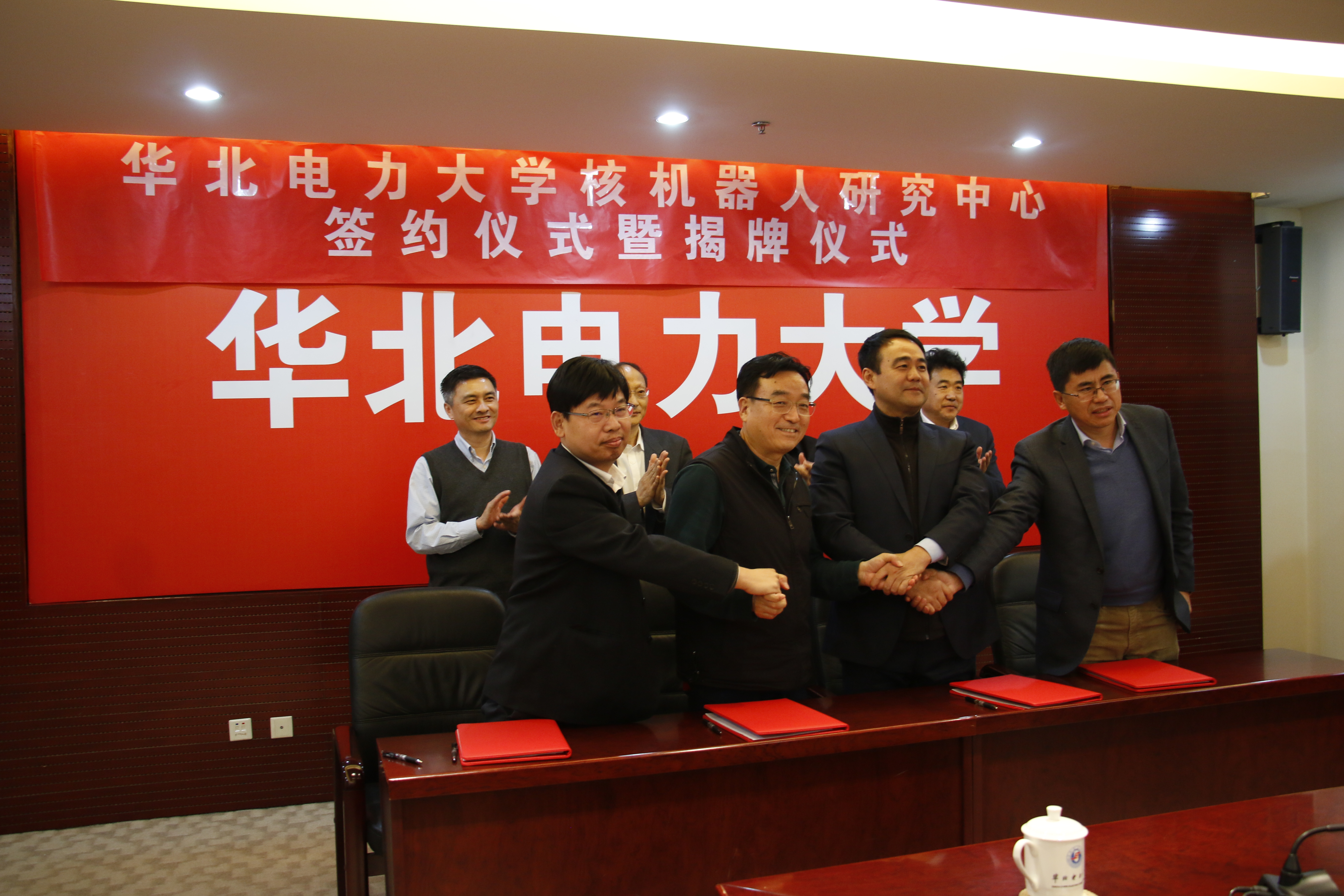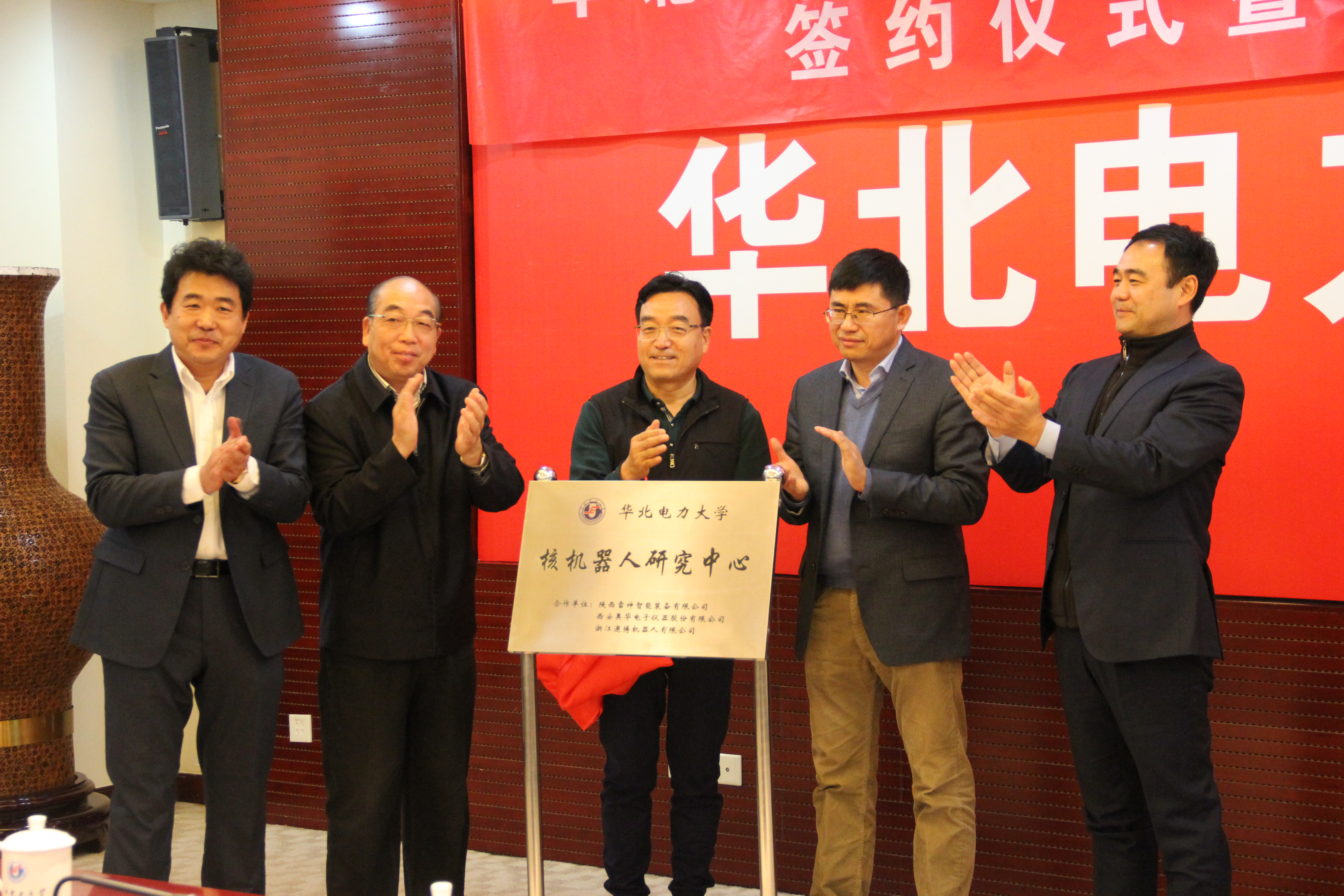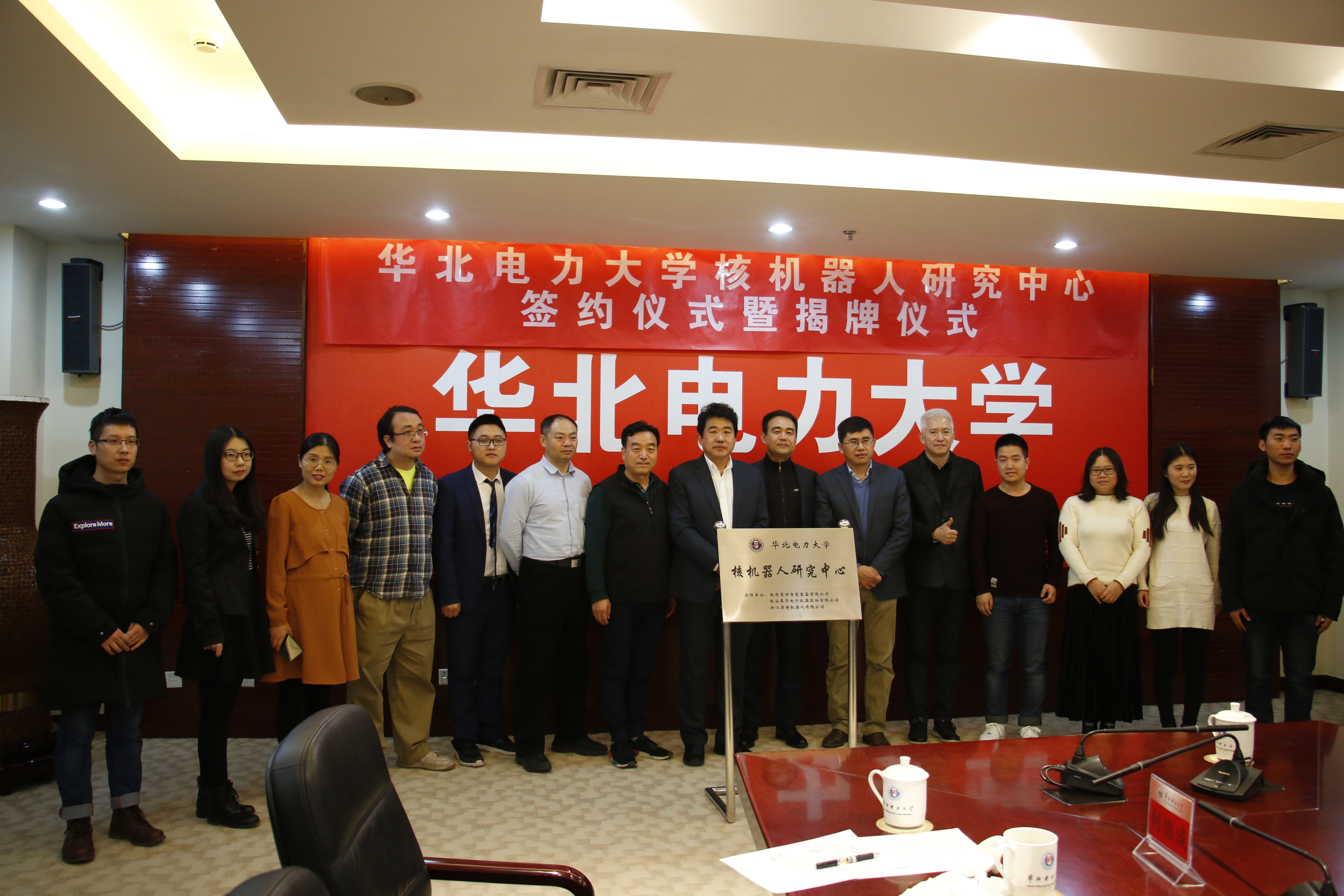 在最后,各单位代表签署了合作协议,并共同举行了中心成立的揭牌仪式,宣告了脱裤吧 核机器人研究中心的正式成立。